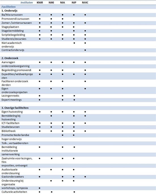De instituten zijn zeer verschillend qua aard, omvang en historie. Hieronder staat een overzicht met de verschillende diensten die instituten aanbieden. Het is verstandig om altijd ook nog even de website van het betreffende instituut checken voor het actuele aanbod.