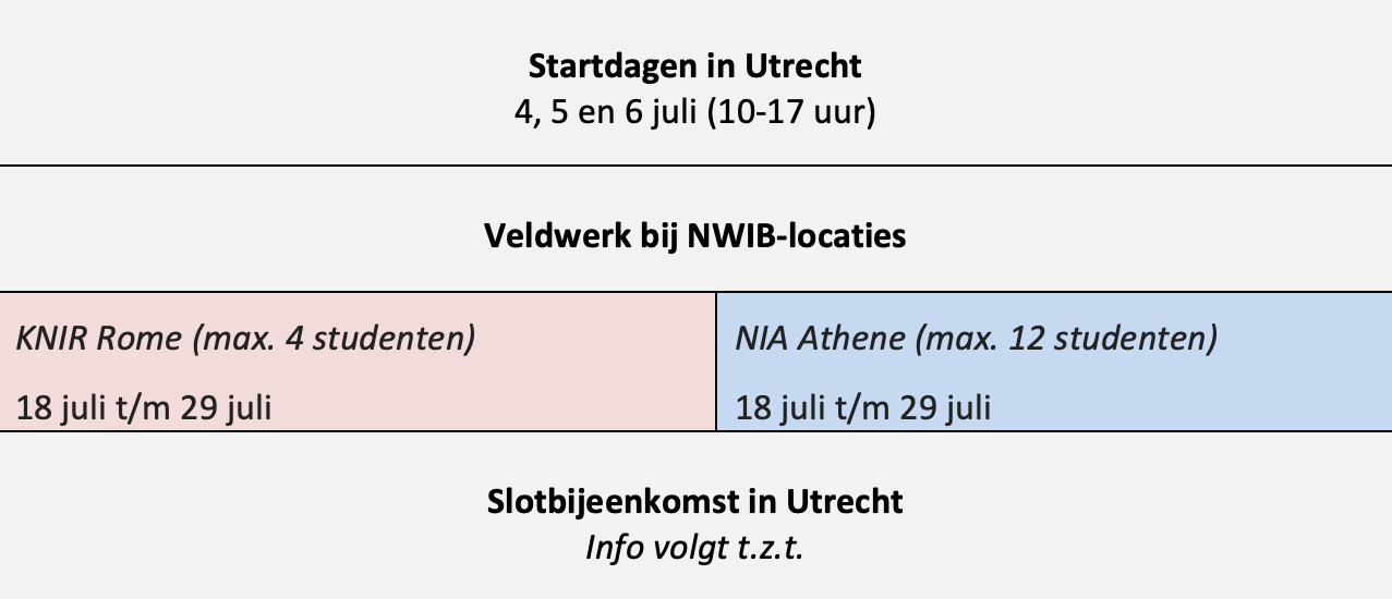 Tijdens deze introductiedagen ontmoet je de begeleider van jouw NWIB in Utrecht en werk je samen met je team aan de voorbereiding van het onderzoek om zo goed beslagen ten ijs te komen in Athene of Rome. In juli en augustus ga je met je team aan de slag met het veldwerk voor je onderzoeksproject. Je bezoekt erfgoedplaatsen, neemt interviews af en doet onderzoek dat resulteert in een eindrapport. Je wordt hierbij begeleid door één van de begeleiders van het desbetreffende NWIB. Alle eindrapporten worden in het Nederlands opgeleverd, In september is er een slotbijeenkomst in Utrecht waar je als groep je bevindingen presenteert.